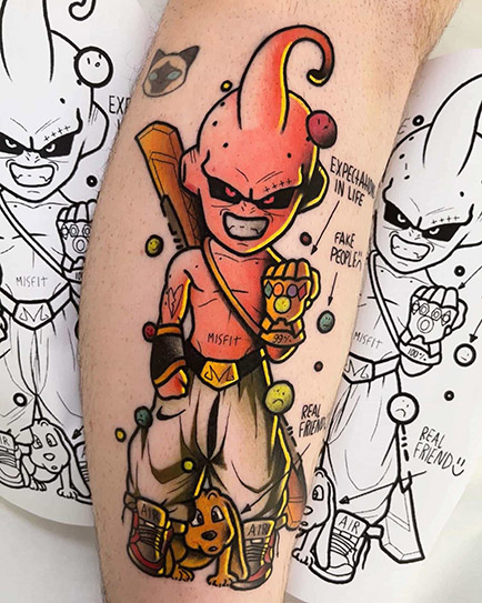 Anime tattoos are characterized by the use of a solid and forceful line that can even be varied in thickness to accentuate certain features more than others. As for color, it is usual to use very well saturated tones and clean gradients. And in addition, dynamic compositions with a lot of movement are used that make the tattoo look like it is sticking out of your skin.